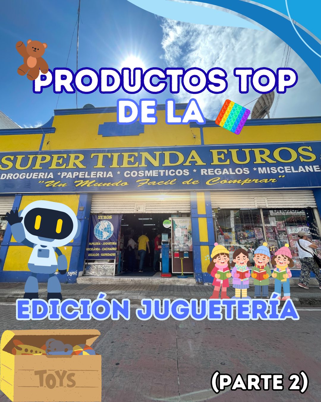 Todo lo que imaginas en un solo lugar En Súper Tienda Euros tenemos la solución. Desde el detalle más pequeño hasta la renovación de tu hogar. Papelería Útiles escolares y de oficina para potenciar tu creatividad. Juguetería La mayor variedad para ver sonreír a los más pequeños. Electrodomésticos Tecnología y eficiencia para tu hogar. Bisutería Los accesorios perfectos